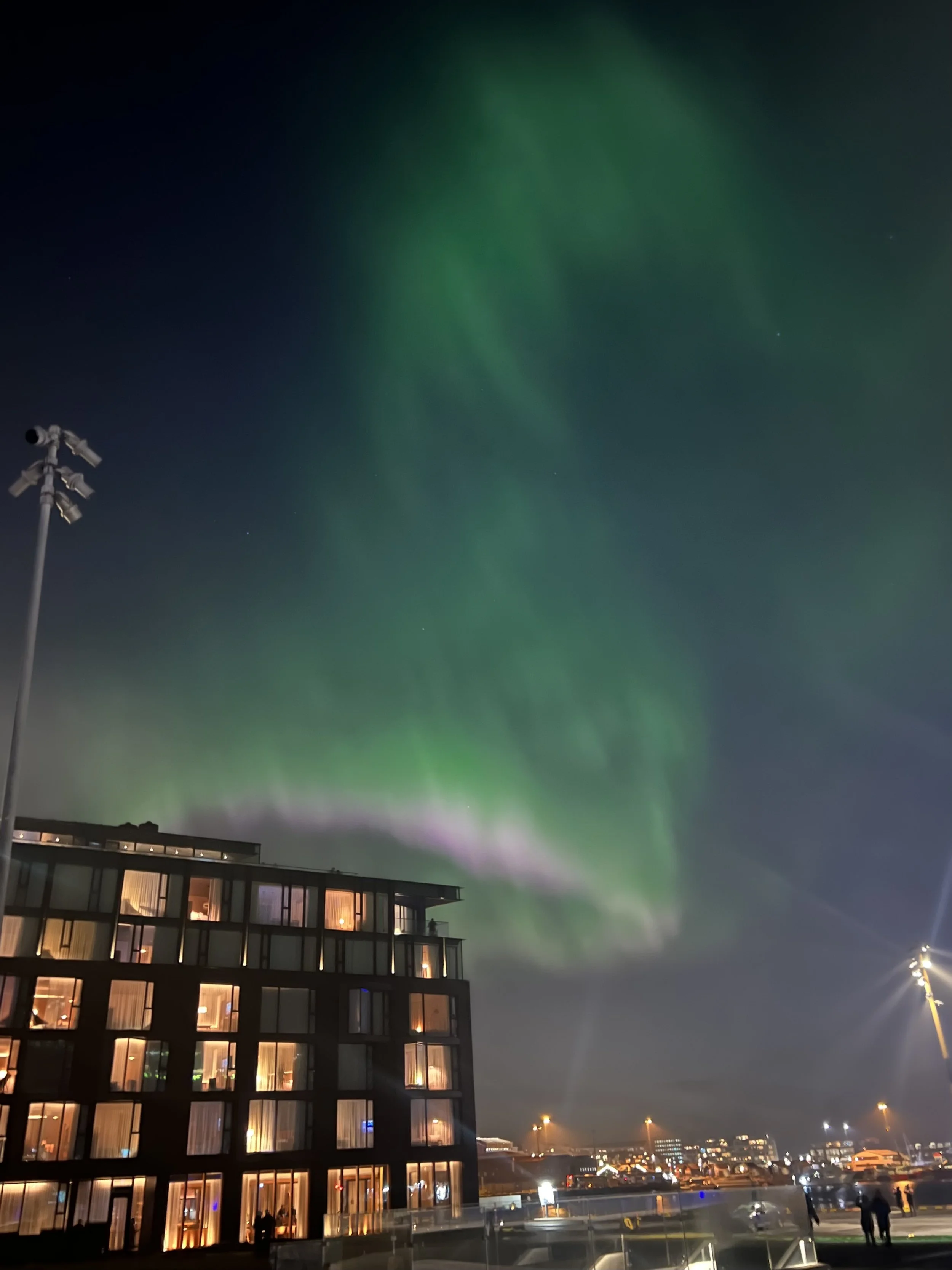 When I was not at the assembly, I spent time exploring what Reykjavik has to offer. I checked out the Whales of Iceland museum, as well as the Þúfa art installation, which features a small wooden house with drying fish at the top. I shopped for traditional Icelandic sweaters, known as lopapeysas, of which I purchased two. I particularly enjoyed experiencing Reykjavik’s food scene as well – I ate at the famous Fiskmarkaðurinn, which features outstanding traditional Icelandic dishes as well as fresh sushi, and I even tried the famous lamb hotdogs at Bæjarins Beztu Pylsur. However, I must confess that my favorite part of Iceland (aside from the assembly of course) was getting to see the northern lights on my last night in Reykjavik, which appeared during the assembly’s final reception. Seeing the northern lights has been on my bucket list for years and witnessing them in person was surreal.